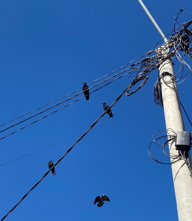 Etwa die Strommasten voller Wirrwarr und Krähen..