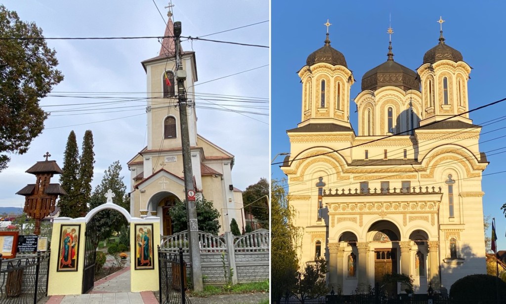 Orthodoxe Kirchen erkennt man an ihren bunten Wandbemalungen und/oder ihren besonderen Kreuzen auf den Türmen.