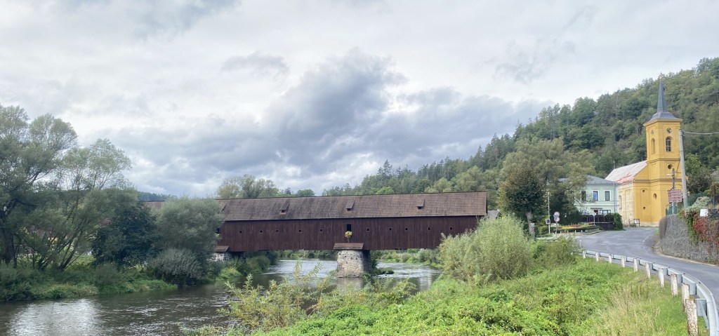1.10.2024 Abschied von Karlsbad: letzter Spaziergang mit Michael zur schönen Holzbrücke über die Eger in Kyselka…