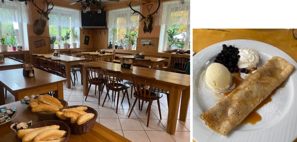 ..danach feine Palatschinken im Garten (bei dieser Gelegenheit habe ich gelernt, dass das einfach nur unsere ‘Crêpes’ sind), gefolgt von einem letzten Essen mit Michael im Camping-Restaurant, wo eigentlich nur die vielen Jagd-Trophäen an den Wänden etwas stören..