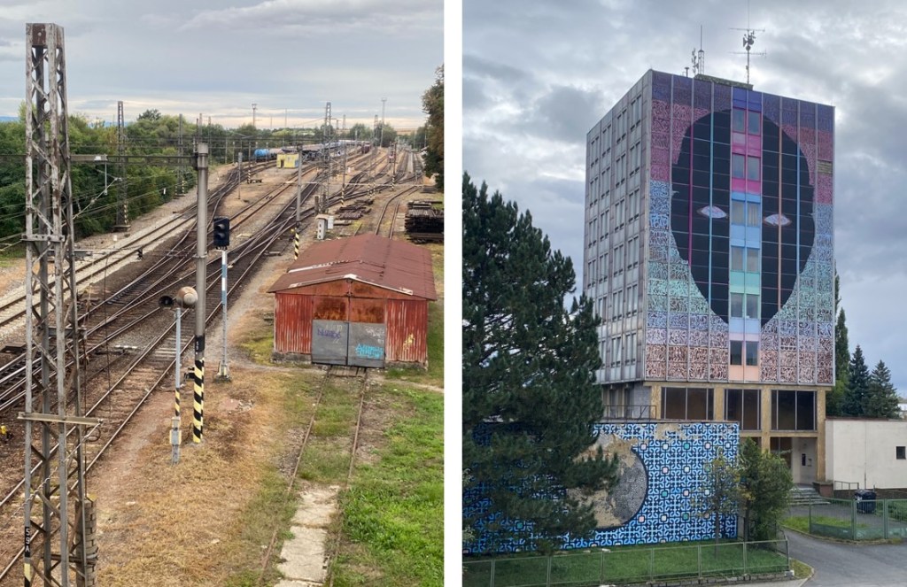 In den Ort Kutná Hora hinein geht man über eine Brücke mit dieser Aussicht. Vor der Hütte links überqueren Fussgänger routinemässig die Schienen, und die originelle Graffiti-Wand gehört scheints zum ‘Planet Music Club’.
