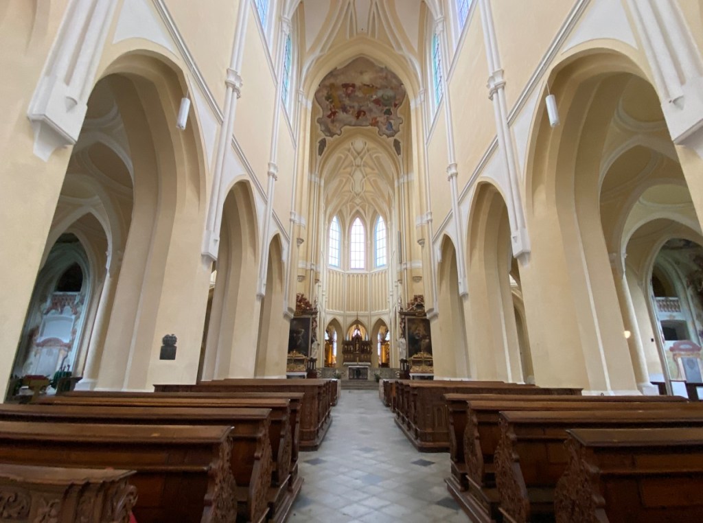 Die gewaltige Kathedrale Maria Himmelfahrt in Sedlec bei Kutná Hora wurde im 13. Jahrhundert erbaut, als die Abtei der Zisterzienser auf diesem Grundstück reich geworden war durch den Silberabbau. Sie war damals das grösste Sakralgebäde in Böhmen und Mähren und berühmt für ihre ‘Böhmische Kappe’, wie das freitragende Gewölbe genannt wurde.