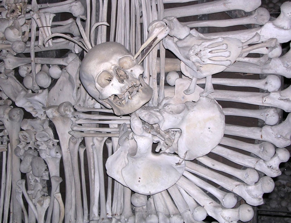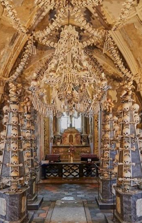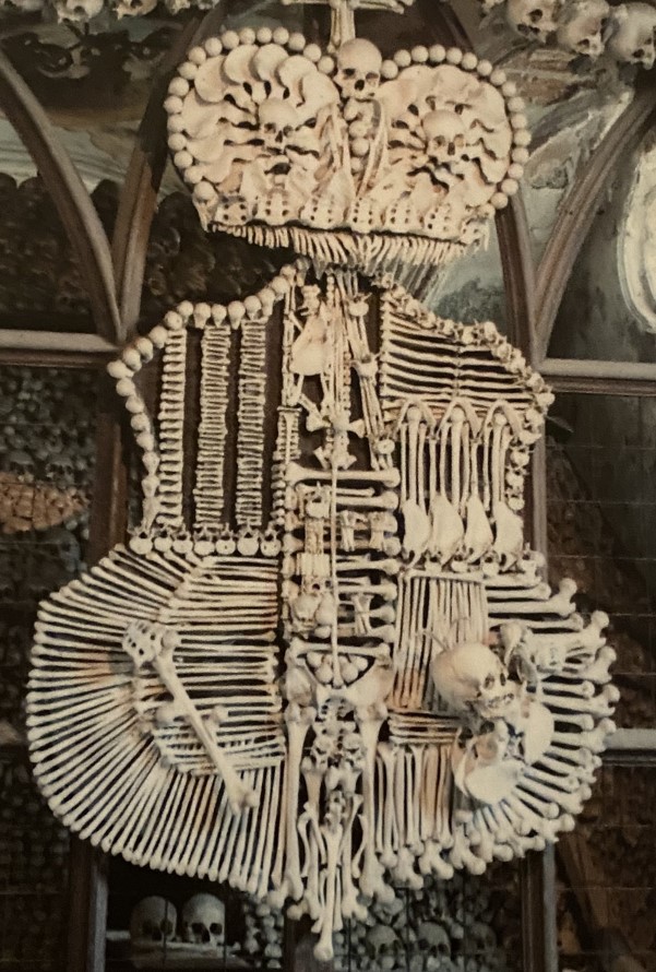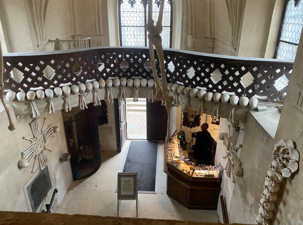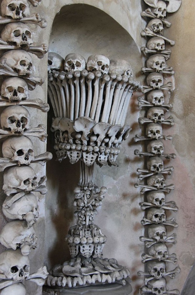 Die fränkische Fürstenfamilie Schwarzenberg kaufte die Kirche und beauftragte 1870 einen Schreiner und Holzschnitzer mit dem Bau der Innenausstattung für das Beinhaus. Dafür verwendete der Handwerker die Knochen von etwa 10’000 Skeletten. Der Effekt ist erstaunlich. Und überraschend ästhetisch. Memento mori.