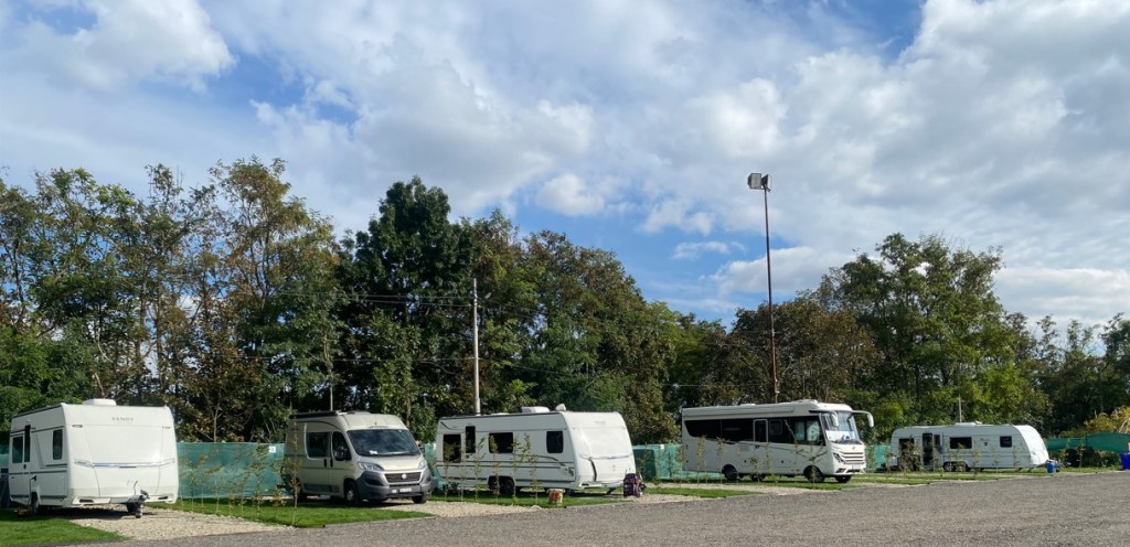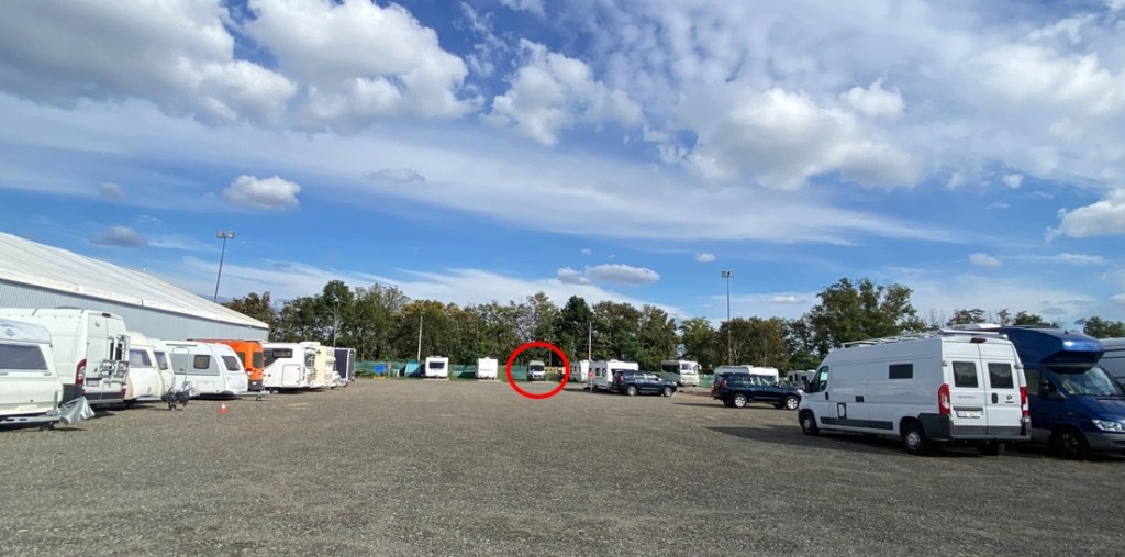 So sieht man ihn von etwas weiter entfernt: Ich stehe immer noch im gepflegten Rasenstreifen ganz hinten, aber links sieht man nun auch die grosse Lagerhalle für eingestellte Wohnmobile und auf dem ganzen riesigen Platz viele nicht benutzte WoMos.