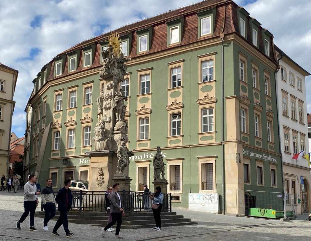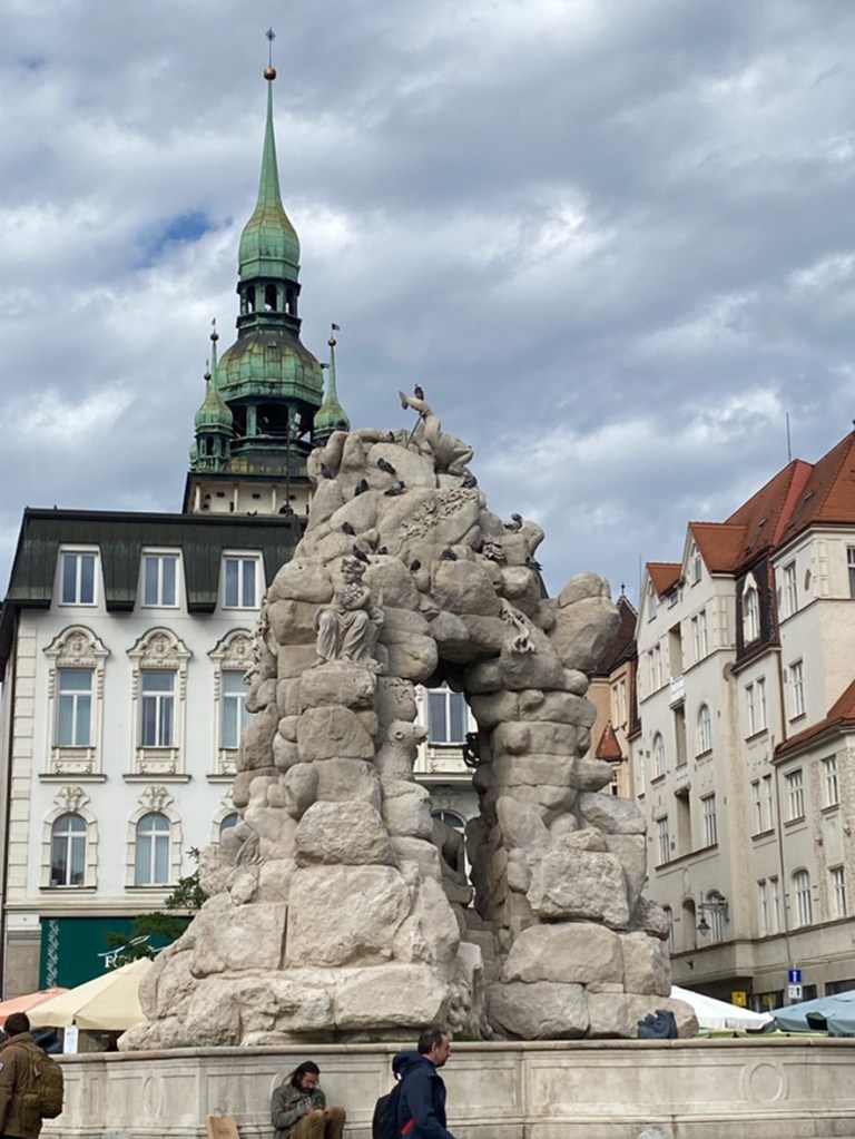 Der barocke Parnas-Brunnen aus dem 17. Jahrhundert dominiert den Markplatz und stellt eine Höhle im Gebirge dar. Drei Figuren darin symbolisieren die antiken Imperien Babylon, Persien und Griechenland.