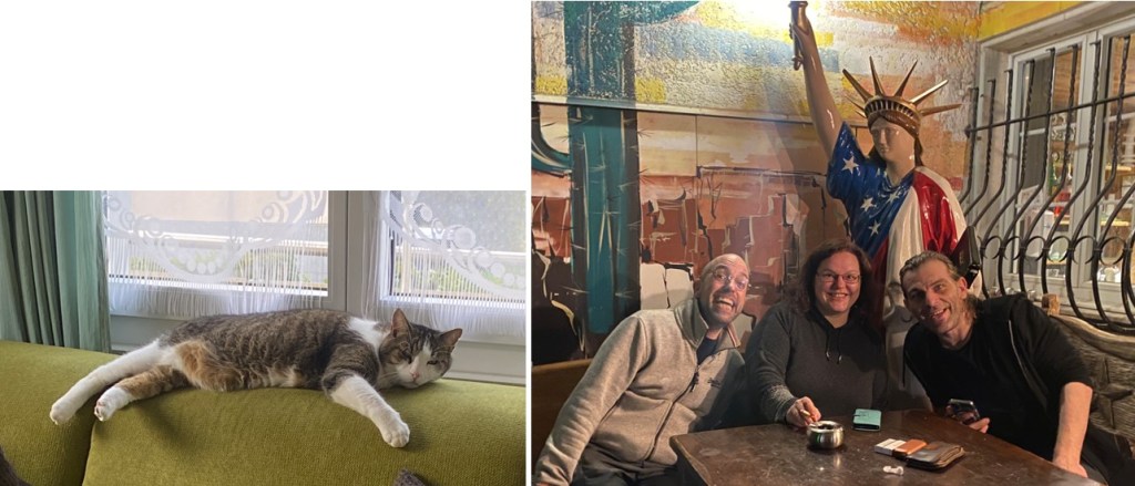 Links chillt Astrids Kater Mailo – und rechts sind wir auf nostalgischem Besuch im Stars & Stripes zu Brütten: Alain, Lisa und Martin