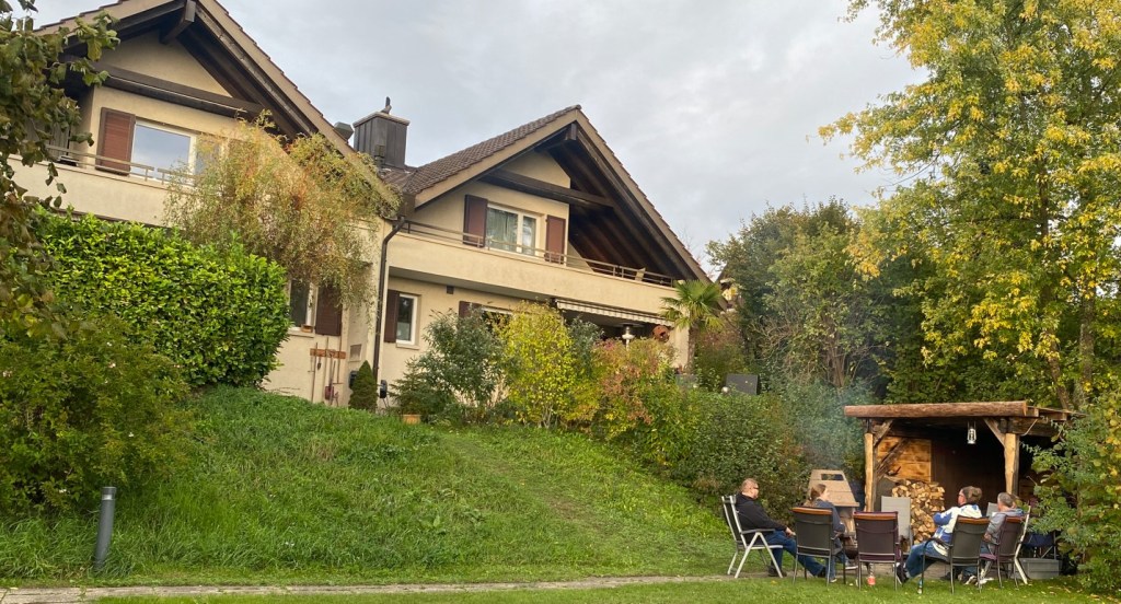Gemütliches Schlussbouquet mit Andy und Urs und ihren Nachbarn Alex und Daniela und (Parkplatz-)Kurt in der frisch renovierten Pergola ! Im Parterre oben rechts habe ich (mit-)gewohnt 😊