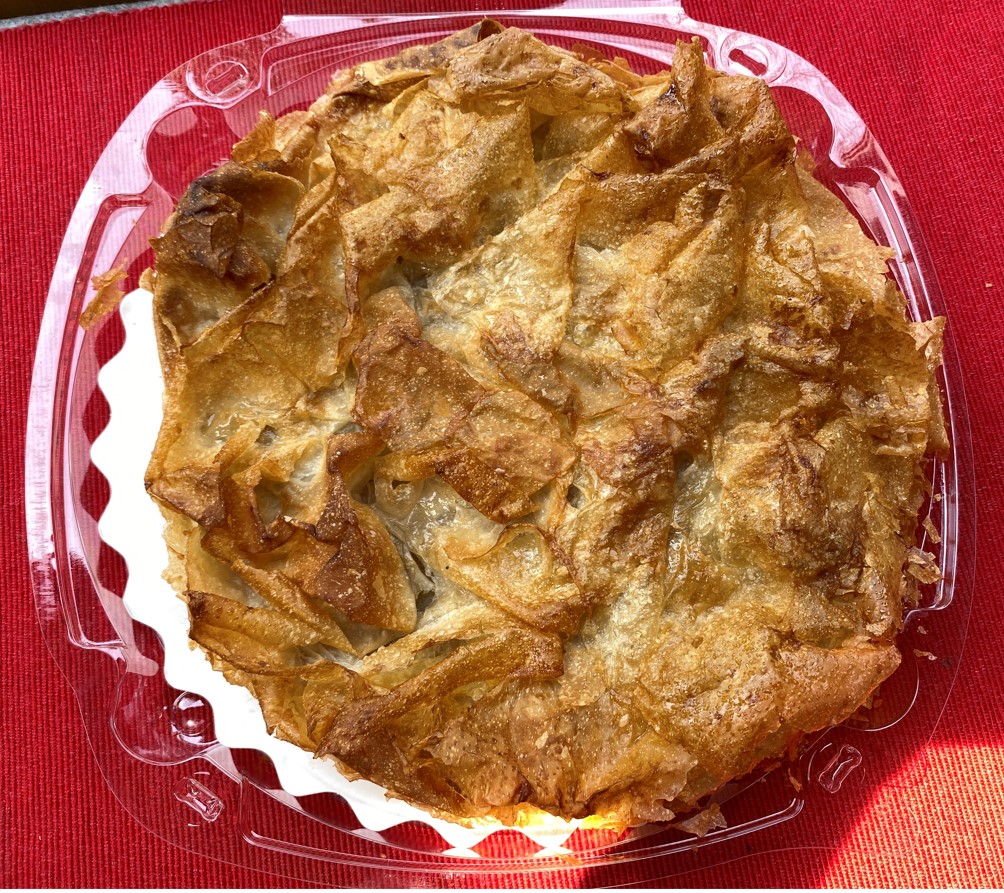 Diese ‘Croustade’ ist eine Spezialität aus dieser Gegend und wird hier von einem Bauernpaar hergestellt. Sie besteht aus von Hand seidenpapierdünn ausgezogenem Teig und enthält vor allem in Armagnac gebadete Äpfel und braunen Zucker.