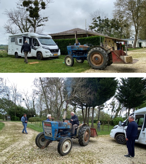 Gestern wurde ein zweiter Platz besetzt von einem holländischen Paar – und heute musste Arie deren Wohnmobil aus der regennassen Wiese ziehen mit dem alten Traktor. Ich war am nächsten Tag dran – und habe es geschafft, nach dem problemlosen Sprung auf die Strasse einen Betonklotz mitzuschleifen mit meiner bodennahen Stufen-Einfassung, die nun etwas lädiert aussieht. Wieder etwas auf der immer länger werdenden Todo-Liste..