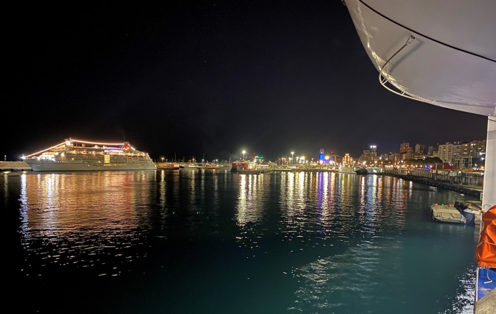 Die Überfahrt war deutlich unruhiger als letztes Mal, und ich überlegte wieder einmal leicht schwankend, ob ich besser auf das Nachtessen verzichten sollte, als wir auch schon in Santa Cruz de Tenerife ankamen für einen vierstündigen Zwischenhalt. Vier Stunden für ein gemütliches Nachtessen ohne Schunkeln. Ich habe französisch geübt mit einer rüeblirothaarigen Belgierin, die mit ihrem alten Mischlingshündchen in einem Mercedes-Camper vom alljährlichen Winter-Aufenthalt auf Gran Canaria zurückreiste.