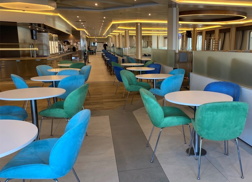 Ich verbrachte meine Zeit mit Spaziergängen an Deck und durch die leeren Aufenthaltsräume, mit Lesen an verschiedenen Orten – hier im Restaurant, mit Fernsehen in der Kabine und mit Siestas, wenn das Meer gar zu unruhig wurde. Nicht nur das Schiff war dasselbe wie letztes Mal, auch die gut gelaunte Crew war es. Die Mahlzeiten waren eine schöne Abwechslung und ich schlief herrlich in meiner Kabine.