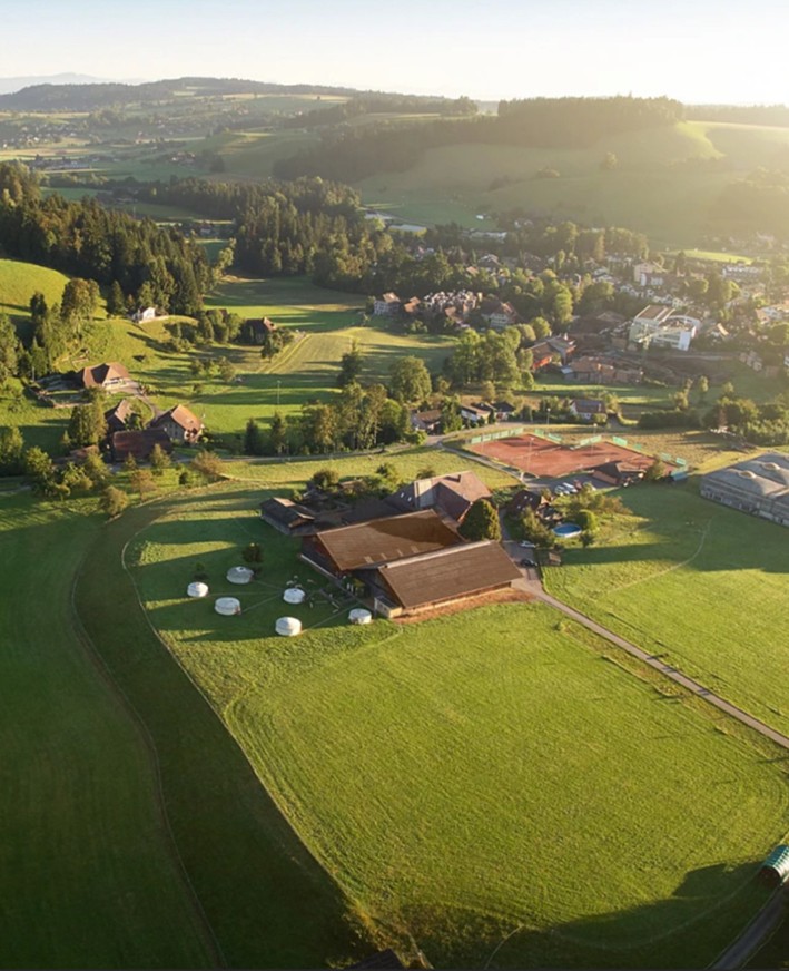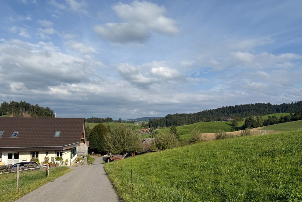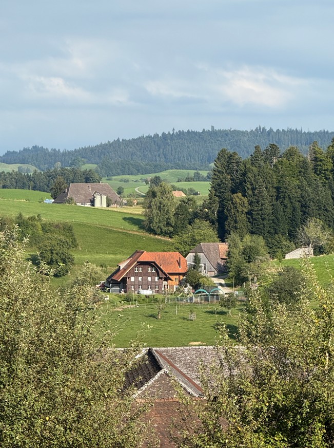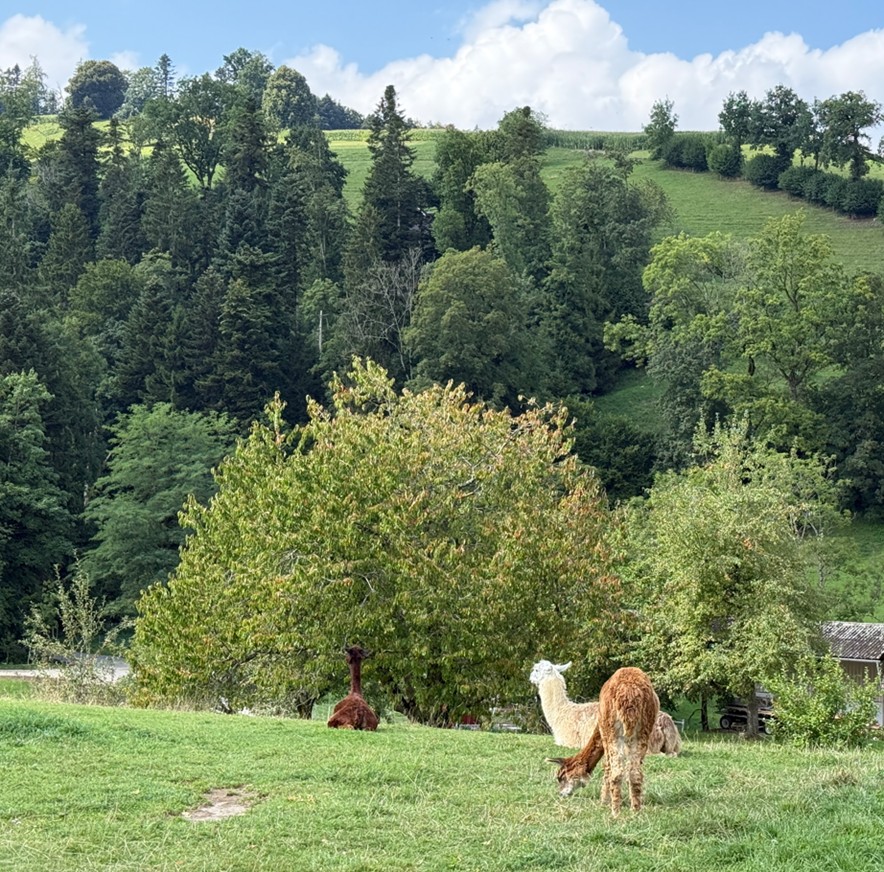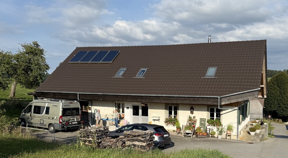 Und dann dies nach 8 Minuten Weiterfahrt: ein Emmentaler Hügel, darauf ein altes Bauernhaus. Und auf der Weide zwei Kamele !