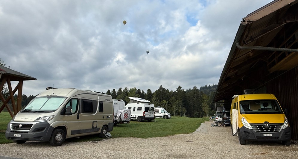 Wir Camper stehen unterm Scheunendach oder auf der Wiese neben den Schafweiden.