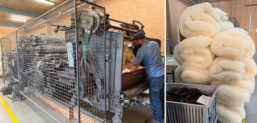 ..auf der Kardiermaschine gekämmt und über stachelige Walzen gezogen, bis sie fein und luftig ist. Dann wird sie zu Wolle versponnen oder zu flauschigen Duvets verarbeitet (Bild rechts).