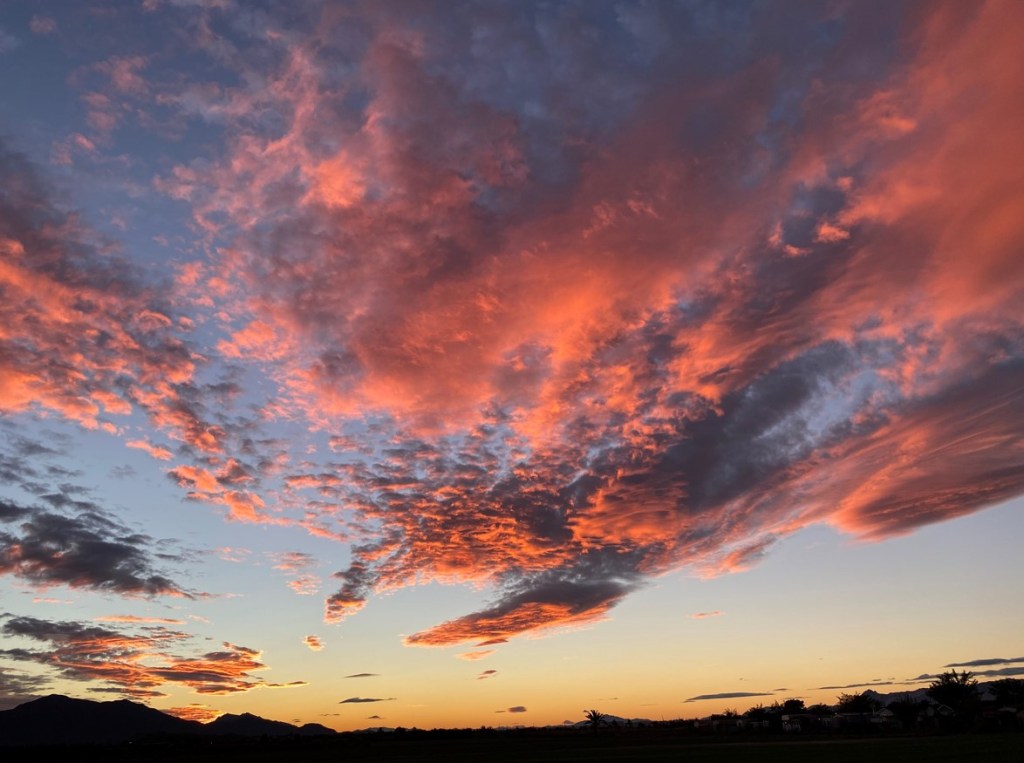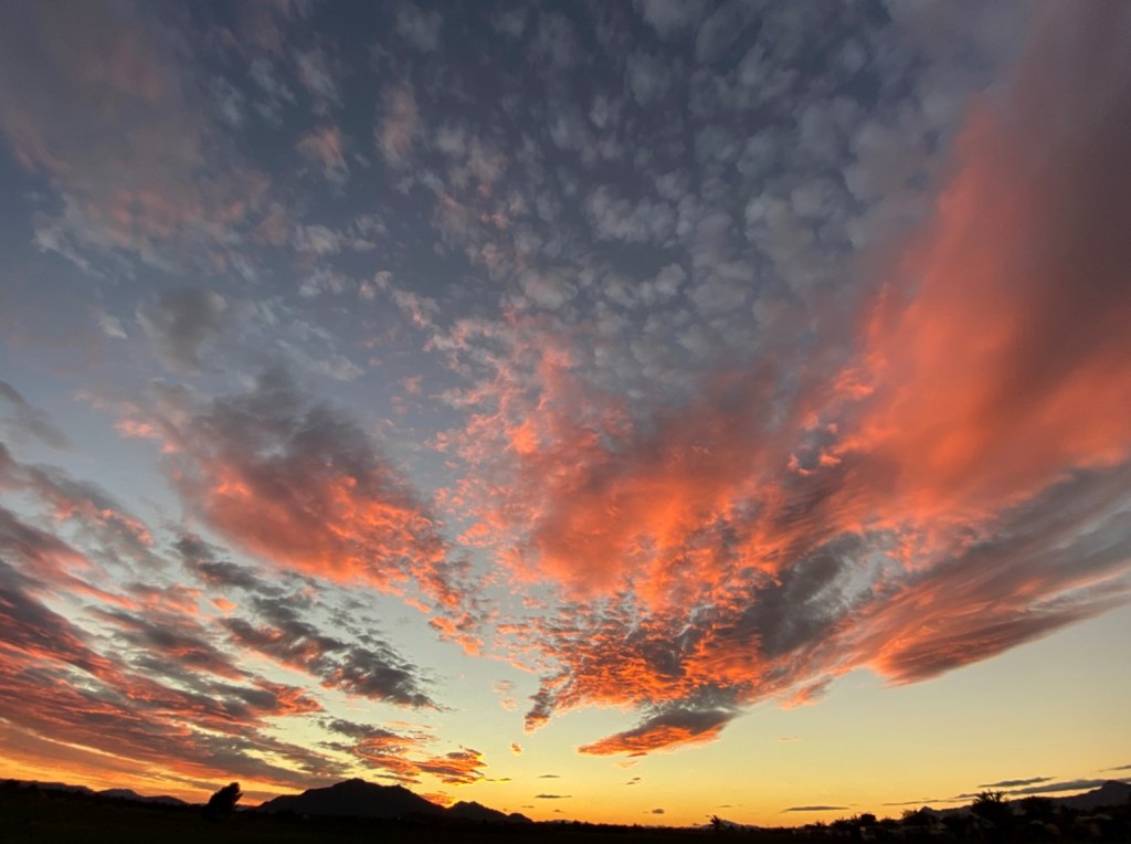 Mir ist die schwache Belegung recht, stehe ich doch allein mit freiem Blick auf eine grosse Wiese und den täglich dramatischen Sonnenuntergang. Hier gefällt es mir viel besser als im Zentrum, wo sich Auto an Auto drängt. Einen kleinen Nachteil hat die schöne Stelle aber schon auch: die Sanitäranlage ist 320 Schritte entfernt; ich darf also nie warten, bis ich ‚wirklich muss’. 😊