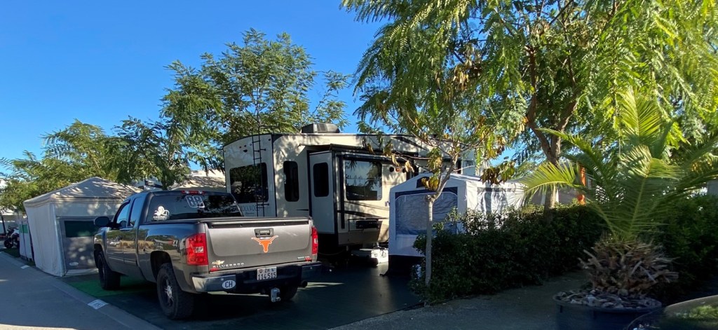 Auf dem Platz stehen all die Riesen-Fahrzeuge, die auf regulären Campingplätzen nicht einmal um die erste Kurve kämen, geschweige denn auf einen Platz mit ihren 12 Metern Länge und oft seitlich ausfahrbaren Wohn- und Schlafzimmern, die das Gefährt glatte 4 Meter breit machen. Hier bin ich schon eher die Mini-Exotin.