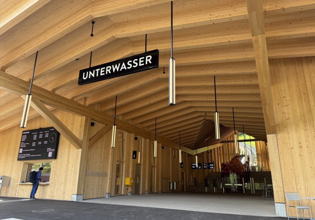 Die Basler Architekten Herzog & de Meuron haben den Bahnhof entworfen (von ihnen stammt übrigens auch die Elbphilharmonie in Hamburg, die an Wellen und Segel erinnert).