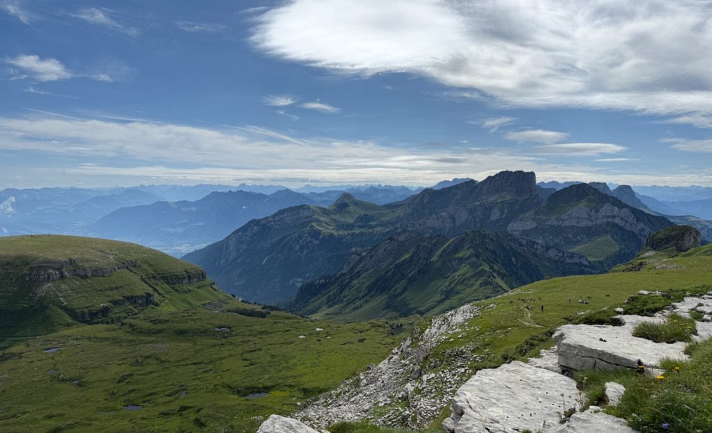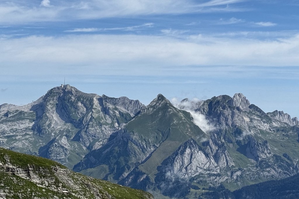 Die Weitsichten vom Chäserrugg aus sind durchs Band traumhaft: Links der Säntis (mit Turm) und in der Mitte die Saxerlücke mit dekorativem Wolkenband durch ihre Schlucht.