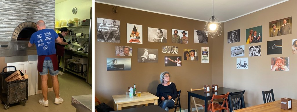 Knusprige Riesen-Pizza aus dem Holzofen in der Pizzeria Retro’ im Fischcamp-Dorf Polesella mit meiner Camper-Nachbarin Birgit.