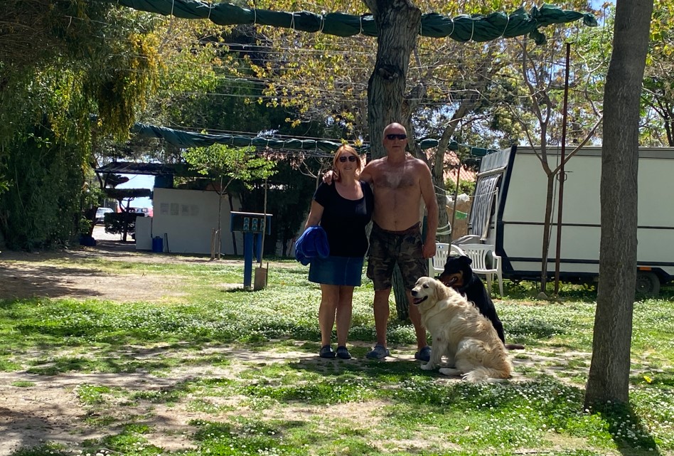 Camping-Nachbarin Monika ist zurück von ihrem Spaziergang mit dem 14jährigen Pino und der wuscheligen Nubi.