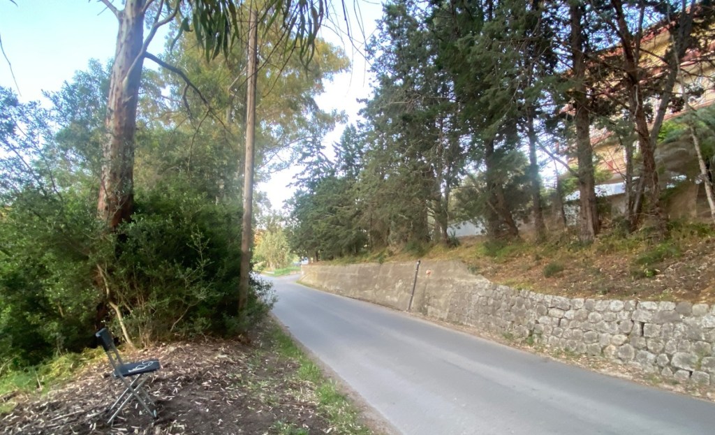 Einziger Nachteil meines Standortes: dieser Tal-Kessel ist ein sehr effektiver Internet-Blocker. Ich habe zufällig entdeckt, dass der mobile Empfang nicht nur am Haupthaus (oben rechts) funktioniert, sondern auch auf diesem Erd- und Laubhügel direkt an der Strasse etwa 30 Meter neben meinem Parkplatz..