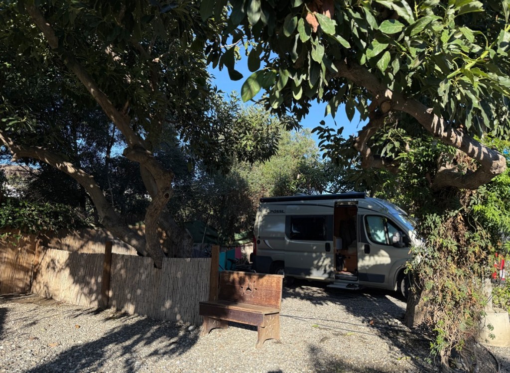 Ich habe einen feinen Platz erwischt unter den Avocado-Bäumen und gleich neben dem leeren Zeltplatz im Vordergrund – und erst noch ohne Nachbar links von mir. Nach den eher ‘eng gestuhlten’ Plätzen der letzten Zeit ist das ein sehr geschätztes Detail !