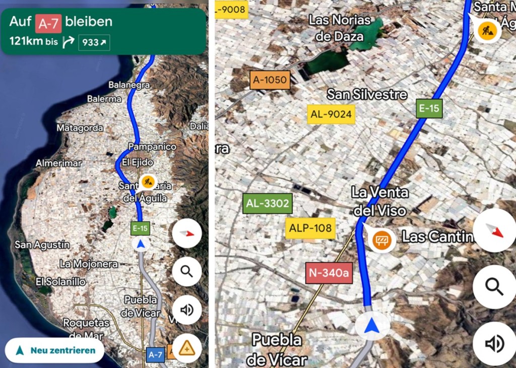 Die Bilder oben sind PrintScreens von unterwegs aus meinem Google-Navi, die blaue Linie ist meine Route.