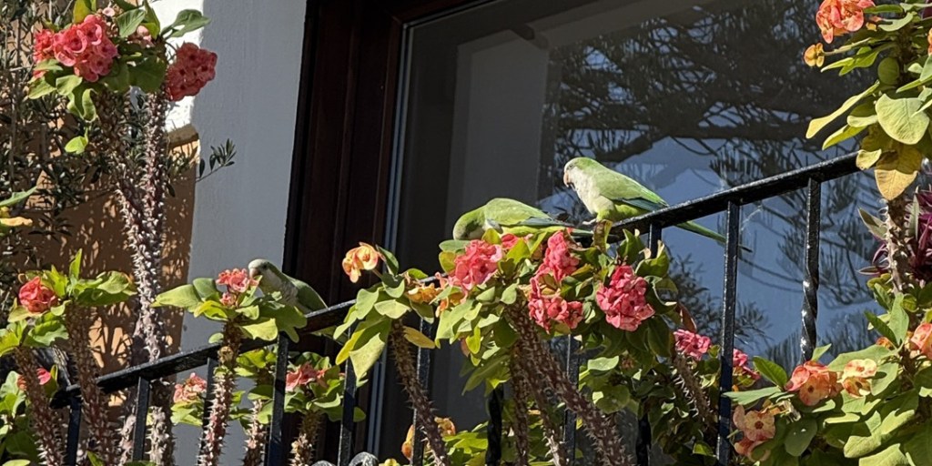 Der rauschenden Papageien-Wolke habe ich nur begeistert nachgeschaut; diese drei haben es sich aber noch auf dem Platz auf einem Balkon gemütlich gemacht.