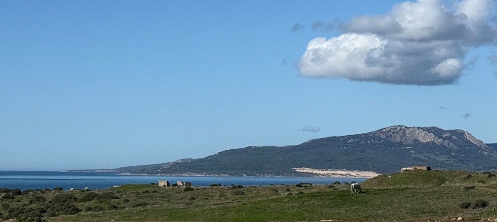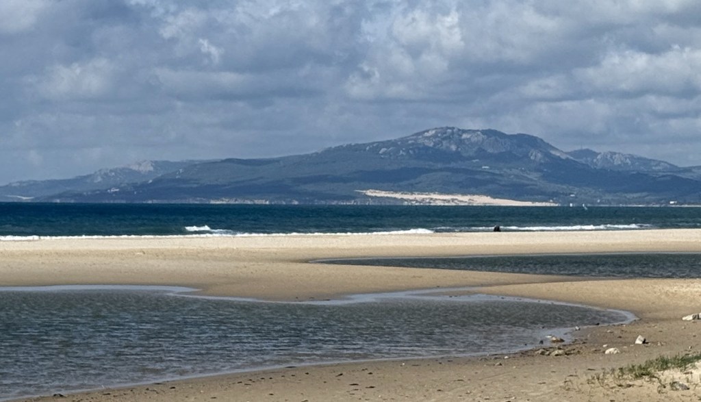 Die sandfarbene, ansteigende Linie im Hintergrund (etwas links von der Bildmitte) ist die Wanderdüne Duna Valdevaqueros, unser nächstes Ziel.