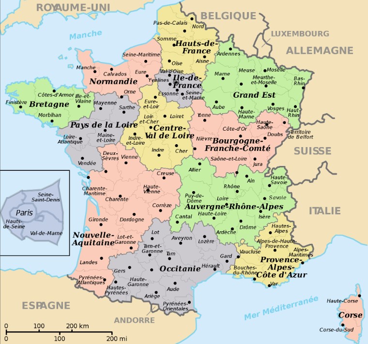 Festland-Frankreich ist seit 2016 in zwölf Regionen aufgeteilt (mit Korsika und Überseegebieten sind es achtzehn) und diese wiederum in jede Menge Départments.
