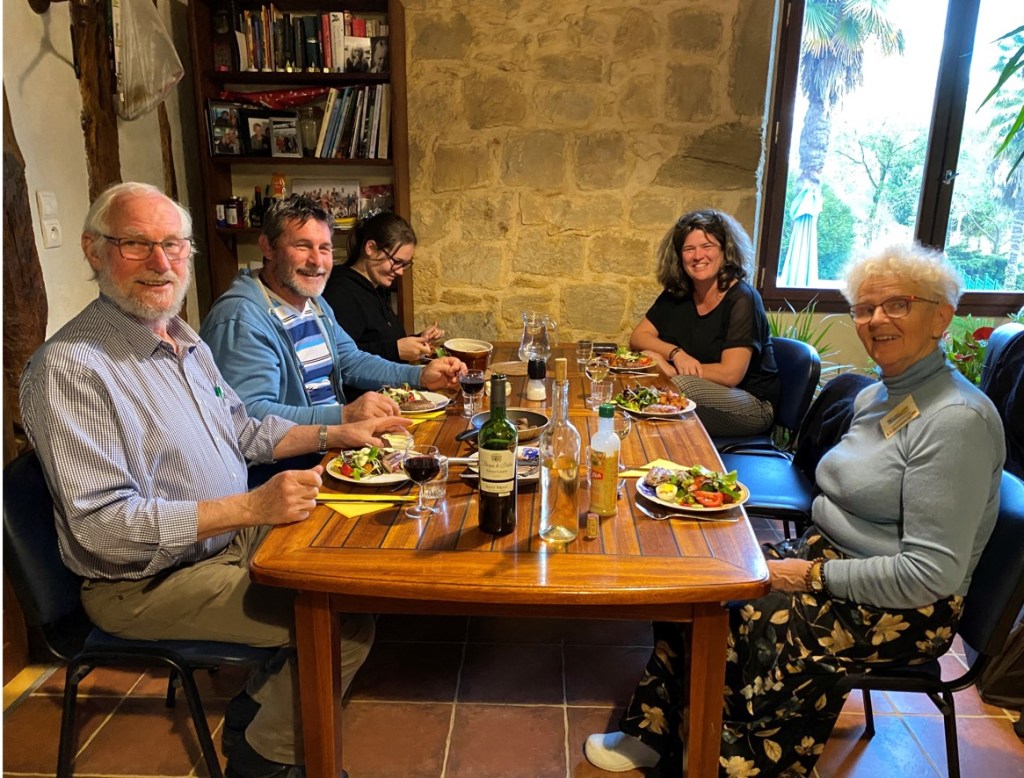 Gemeinsames Nachtessen im alten Herrenhaus. Die Holländer Arie und Hannie haben den Campingplatz siebzehn Jahre lang geführt und ihn vor ein paar Wochen an Jérôme und Vanessa (hinten mit Tochter Fantine) verkauft, um nun doch endlich in den Ruhestand zu treten.