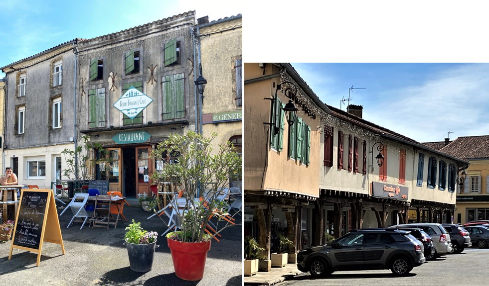 In Spanien wäre dies die Plaza Mayor und autofrei; auf diesem Dorfplatz musste sich immerhin sogar der Carrefour Supermarkt (rechts) unter die Laube begeben, und sein Logo an der Stirnseite der Hausmauer ist nachgerade dezent.