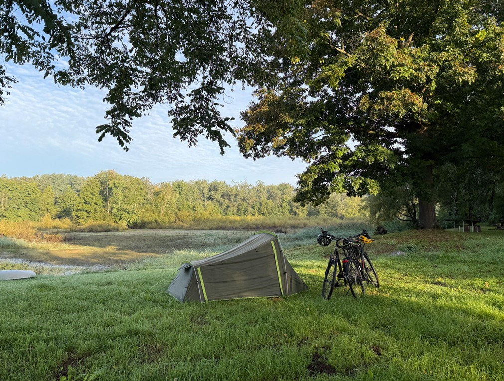 27.9.2025 Nach knapp zwei Fahrstunden kam ich in Gergy (Bourgogne-Franche-Comté) an auf dem ‘Camping Mare de Roy’ mitten im Grünen an einem langsam zuwachsenden Teich.