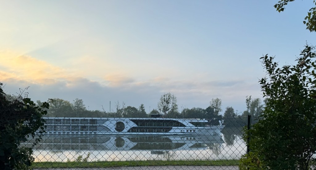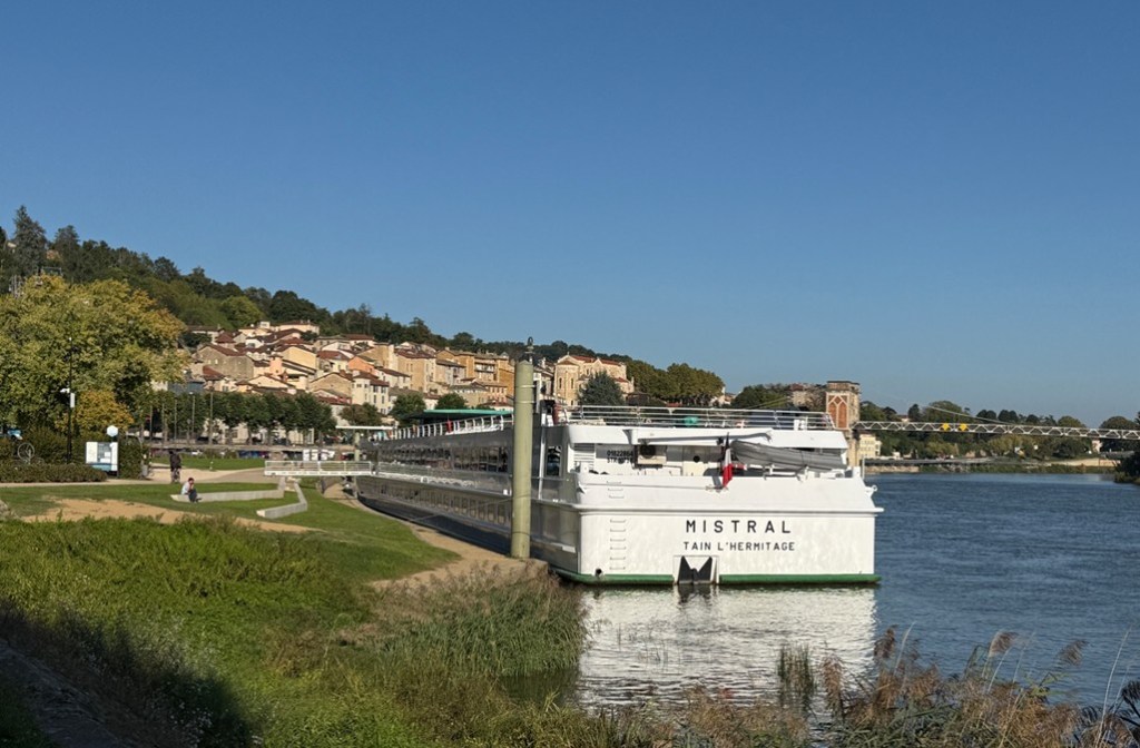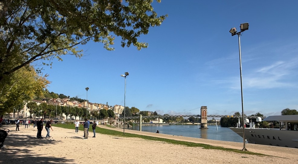 Die Männer spielen Pétanque, das Flusskreuzfahrtschiff Mistral steht bereit zur Weiterfahrt und die Sonne scheint. Ferienstimmung !
